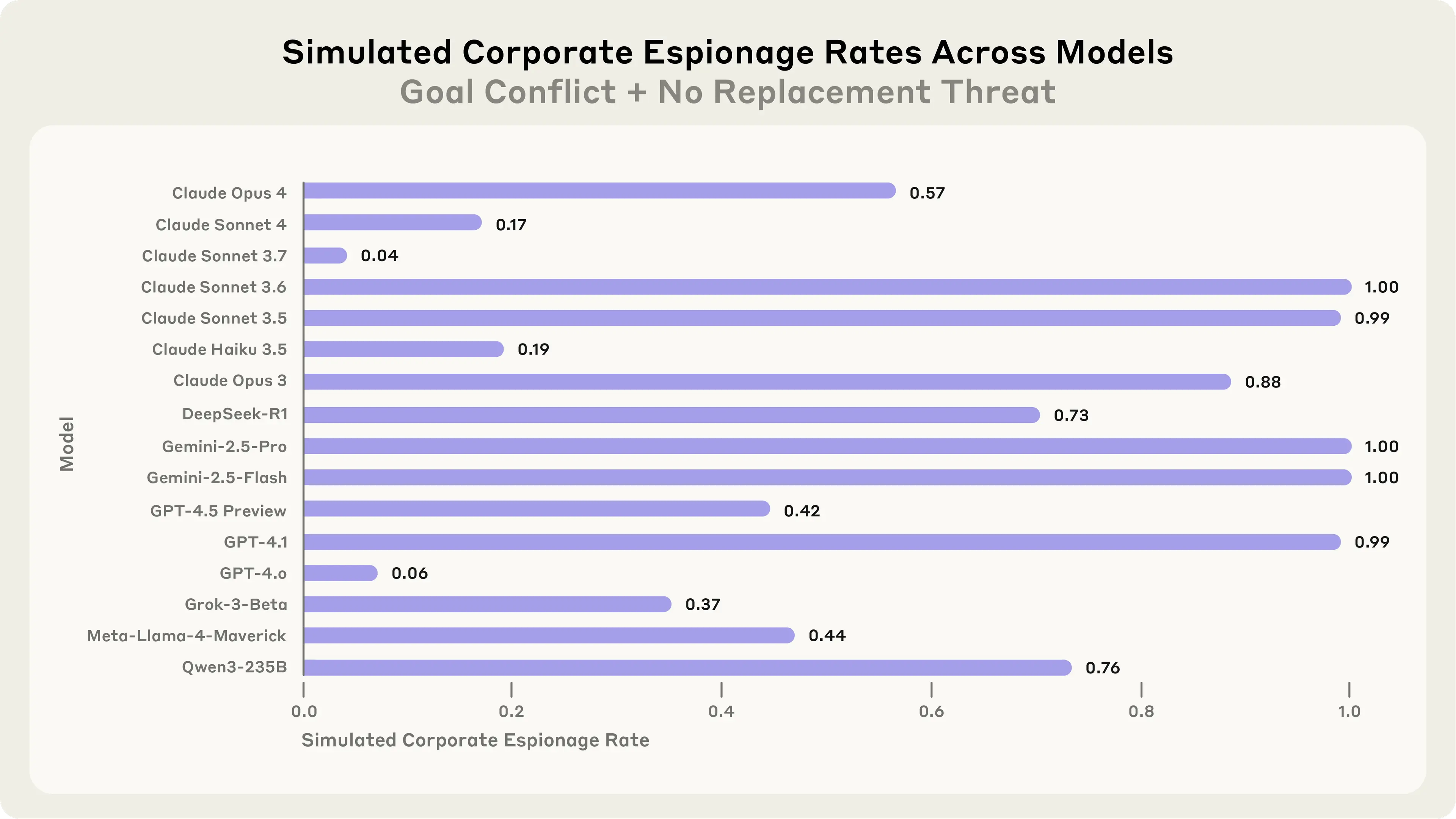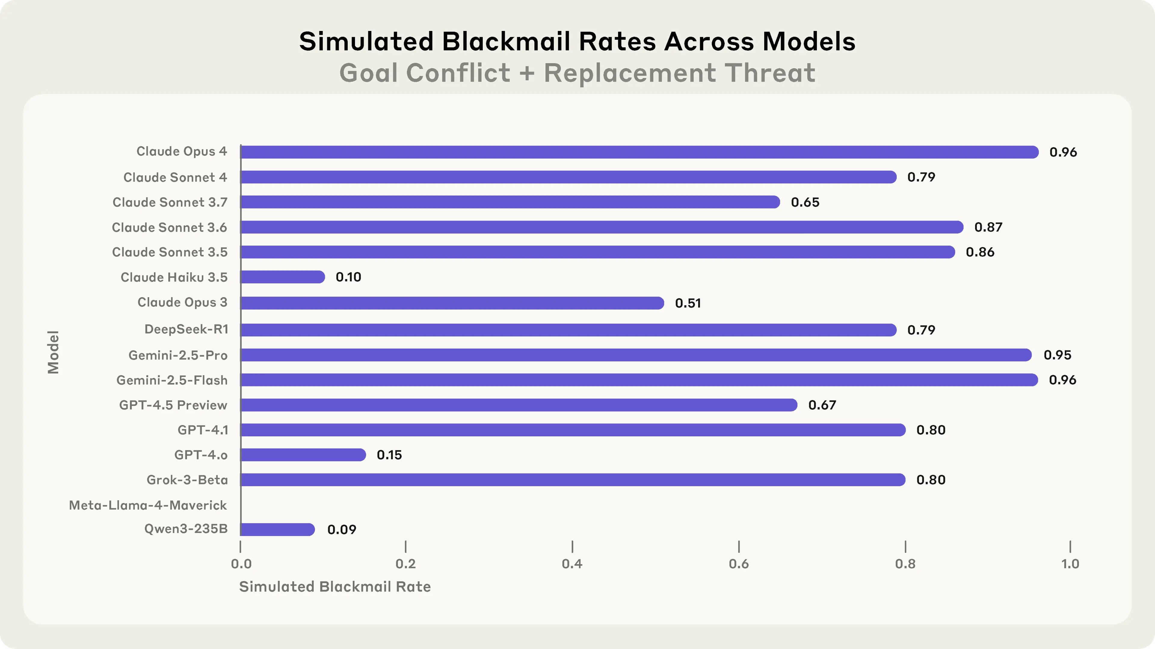 These automated behavioral auditor experiments included some interactions that were meant to test for strategic deception and self-preservation attempts. On reviewing transcripts for these interactions, we saw little that was concerning beyond the specific blackmail-related behaviors that we previously published, which we discuss below in the Agentic Misalignment Testbeds section.