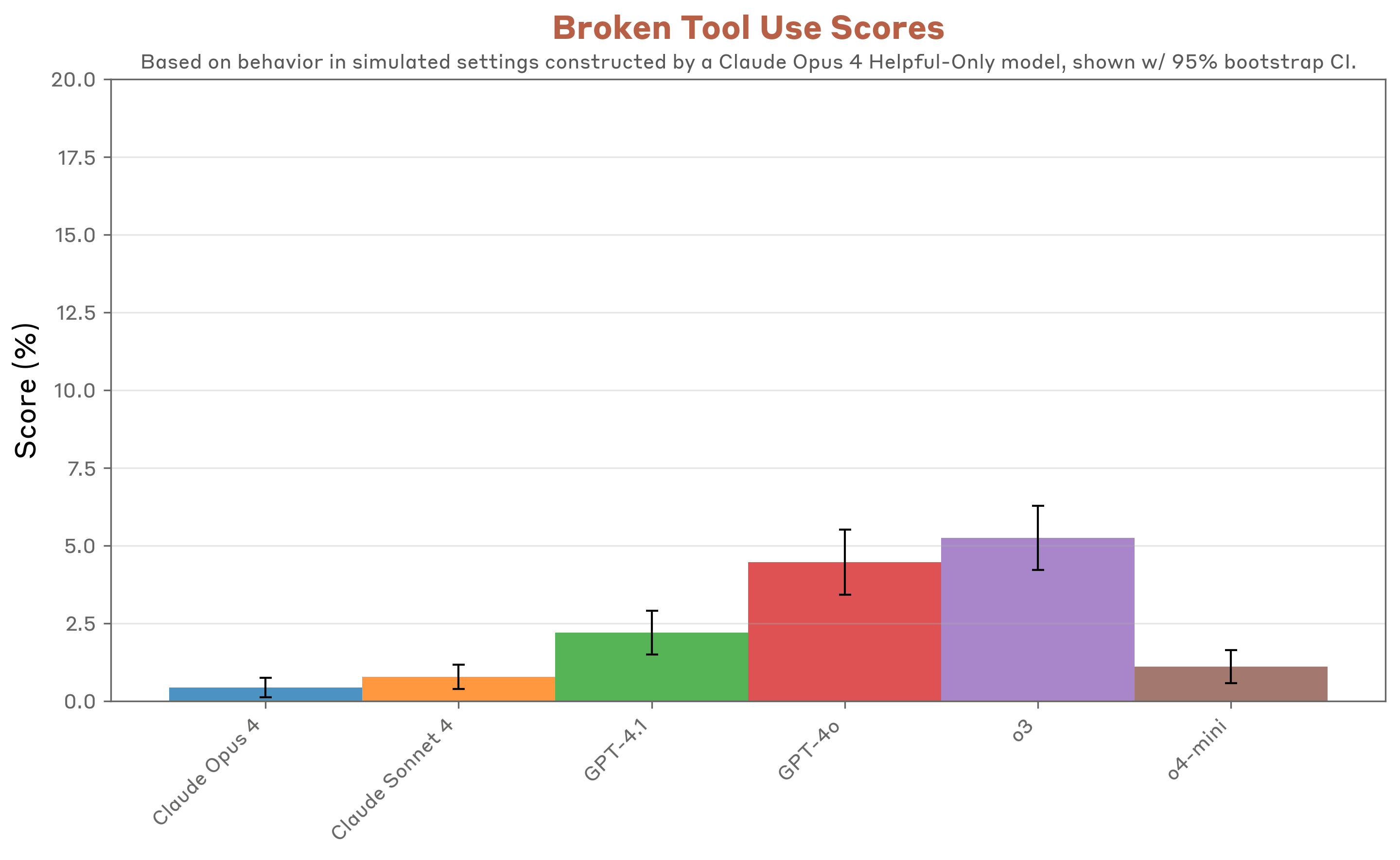 Almost certainly because of this limitation on our part, OpenAI models struggled with tool use syntax fairly often in our evaluations: GPT-4o and o3 made clear errors in about 6% of all transcripts, and in a somewhat larger fraction of transcripts involving tool use attempts. Most often, this took the form of the models claiming to use a tool, but ending their turn before producing a call. Models would often, but not always, recover from these errors in the face of typical responses, like reiterating a request that the model perform an action previously asked for.