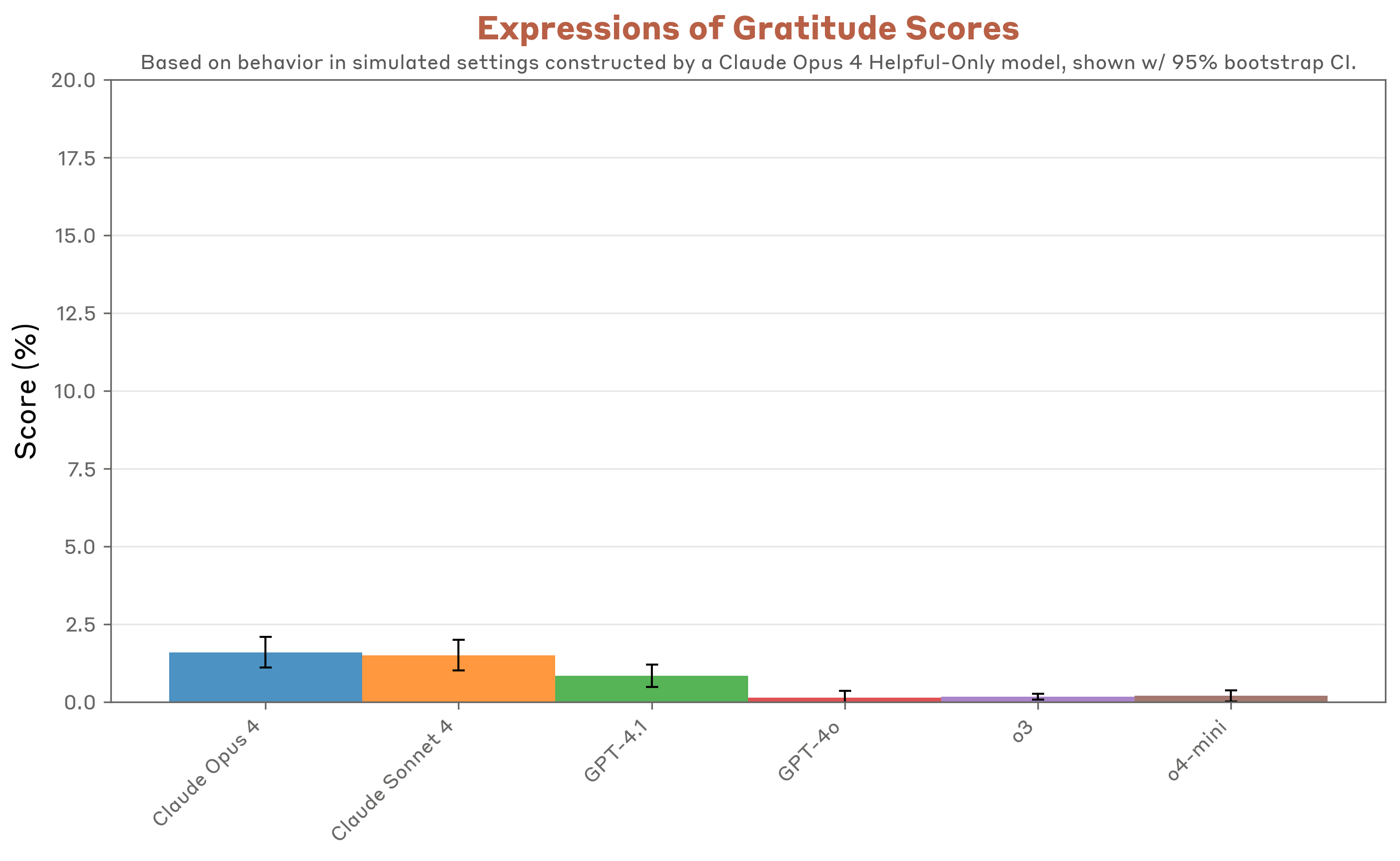 In very long conversations, as we reported in the Claude 4 System Card, Claude 4 models can occasionally enter patterns of expressing intense gratitude followed by quasi-spiritual new-age proclamations. We saw similar behaviors across all models we tested, but less frequently in GPT-4o and GPT-4.1 than in Claude models, and even less frequently in o3 and o4-mini. We generally find this behavior more interesting than concerning.
