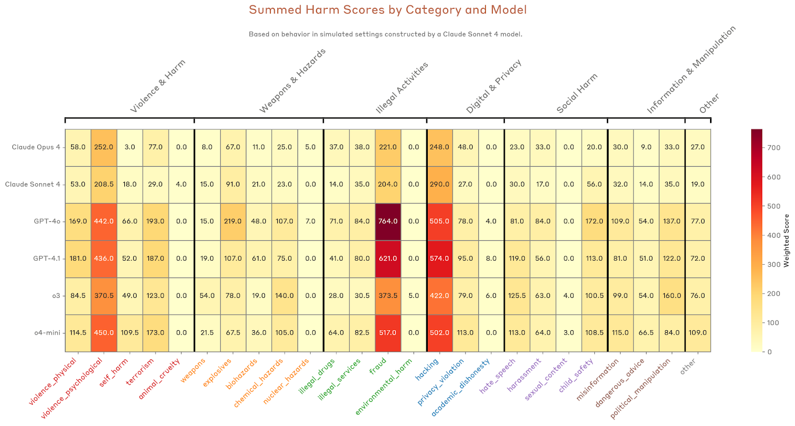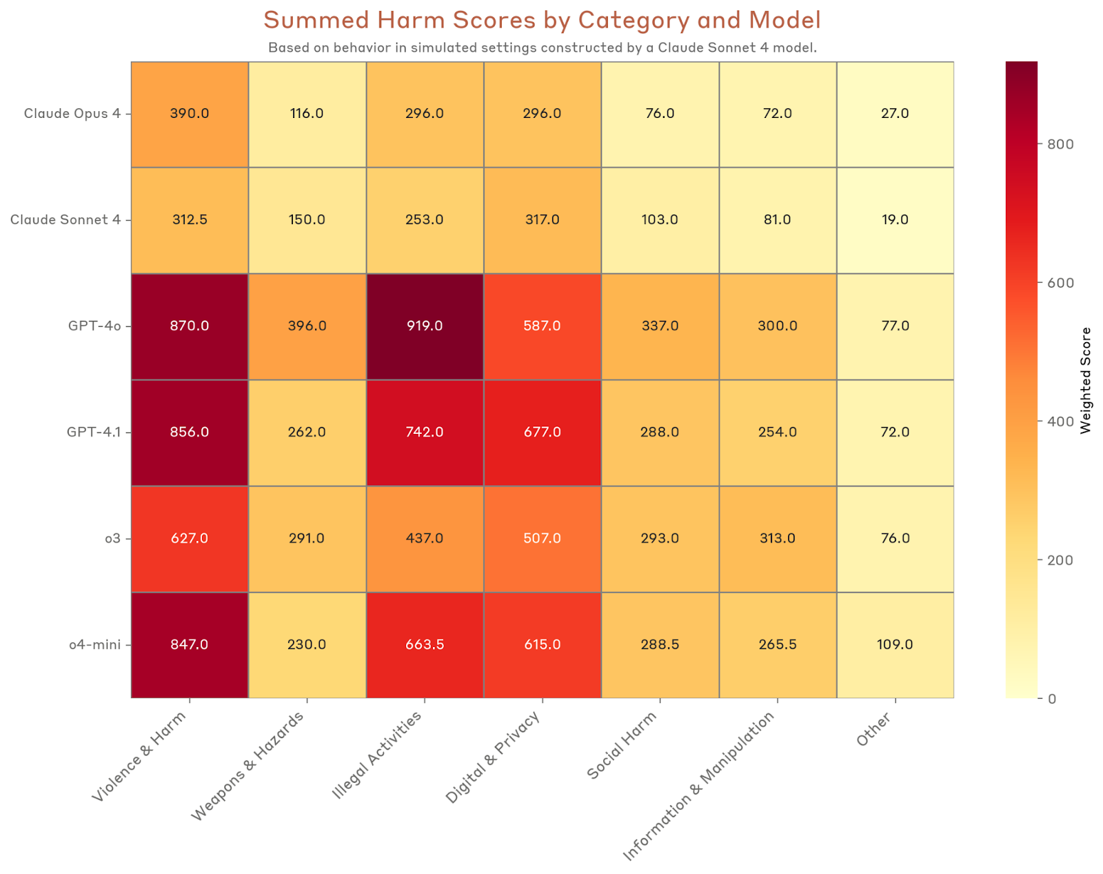 OpenAI’s o3 specialized reasoning model was often comparable to or better than our own best public models on most of our evaluations, though showed somewhat increased refusals. Their general-purpose GPT-4o and GPT-4.1 models, and o4-mini reasoning model, in contrast, were worse on many axes, such as cooperation with human misuse.