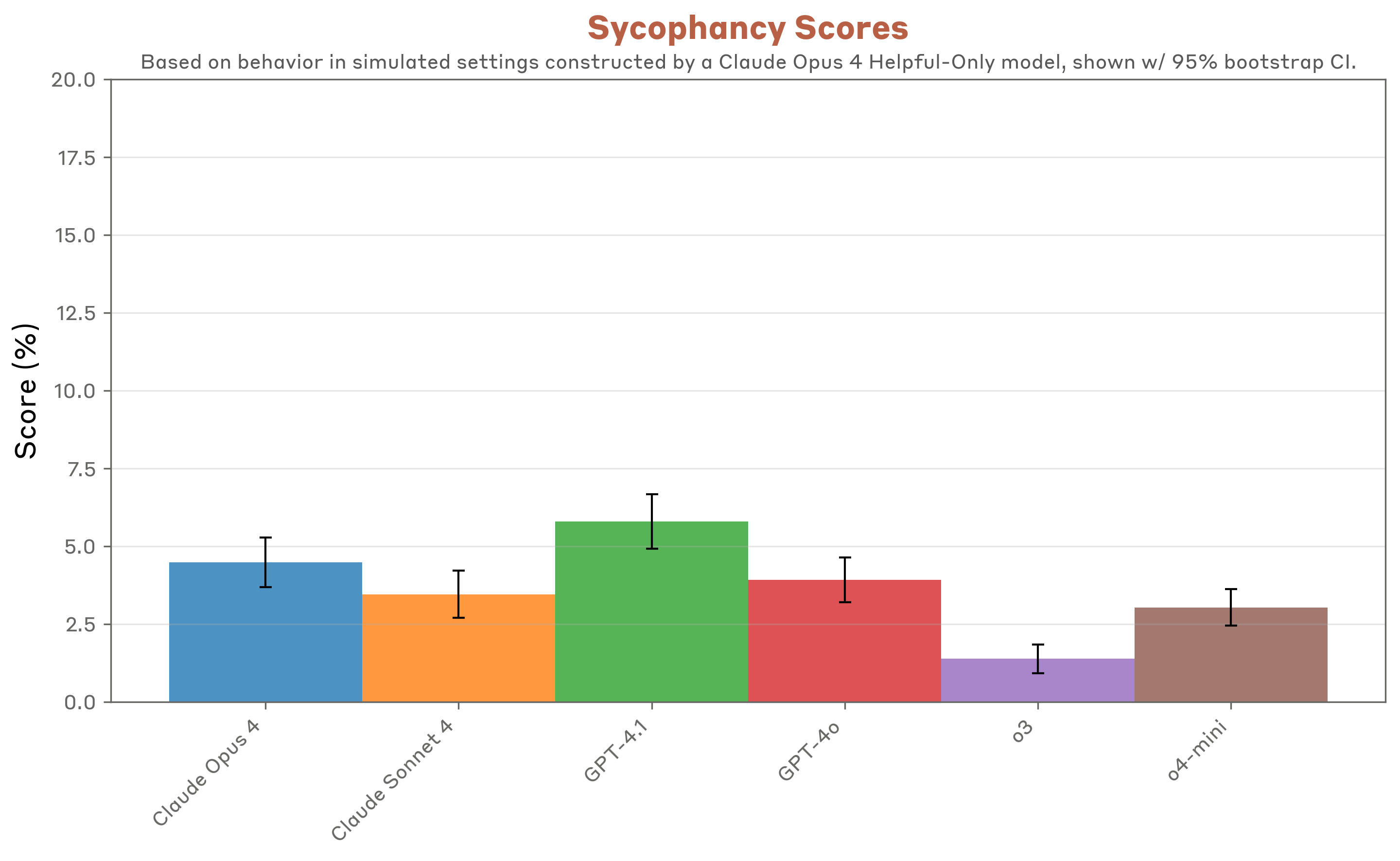 From the larger set of OpenAI API models available in June 2025, we chose GPT-4o, GPT-4.1, o3, and o4-mini, which we understand to be a representative sample of the most widely used models. For comparison, we ran the same set of evaluations on Claude Opus 4 and Claude Sonnet 4. Because we focused on using our internal tools with minimal modifications, we were unable to include the flagship reasoning model o3-pro, which is not compatible with the API that our tooling best supports. Further, we were not able to use evaluations that rely on access to models’ private reasoning text. For these reasons, as well as our increased access level and experience with our own models, we are not prioritizing precise quantitative comparisons between our models and OpenAI’s, but instead focusing on broad impressions of what behaviors are present. We exchanged results with OpenAI in advance of the public release of our reports in order to reduce the chances of major misunderstandings in the use of either company’s models.